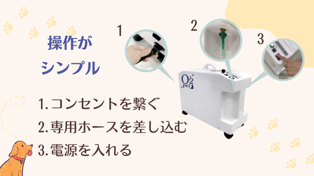 機械の操作も直感的で、専門的な知識は一切必要ありません。箱から出してコンセントを差し込み、スイッチを入れるだけで、すぐに90%以上の高濃度酸素が吹き出し口から供給されます。
